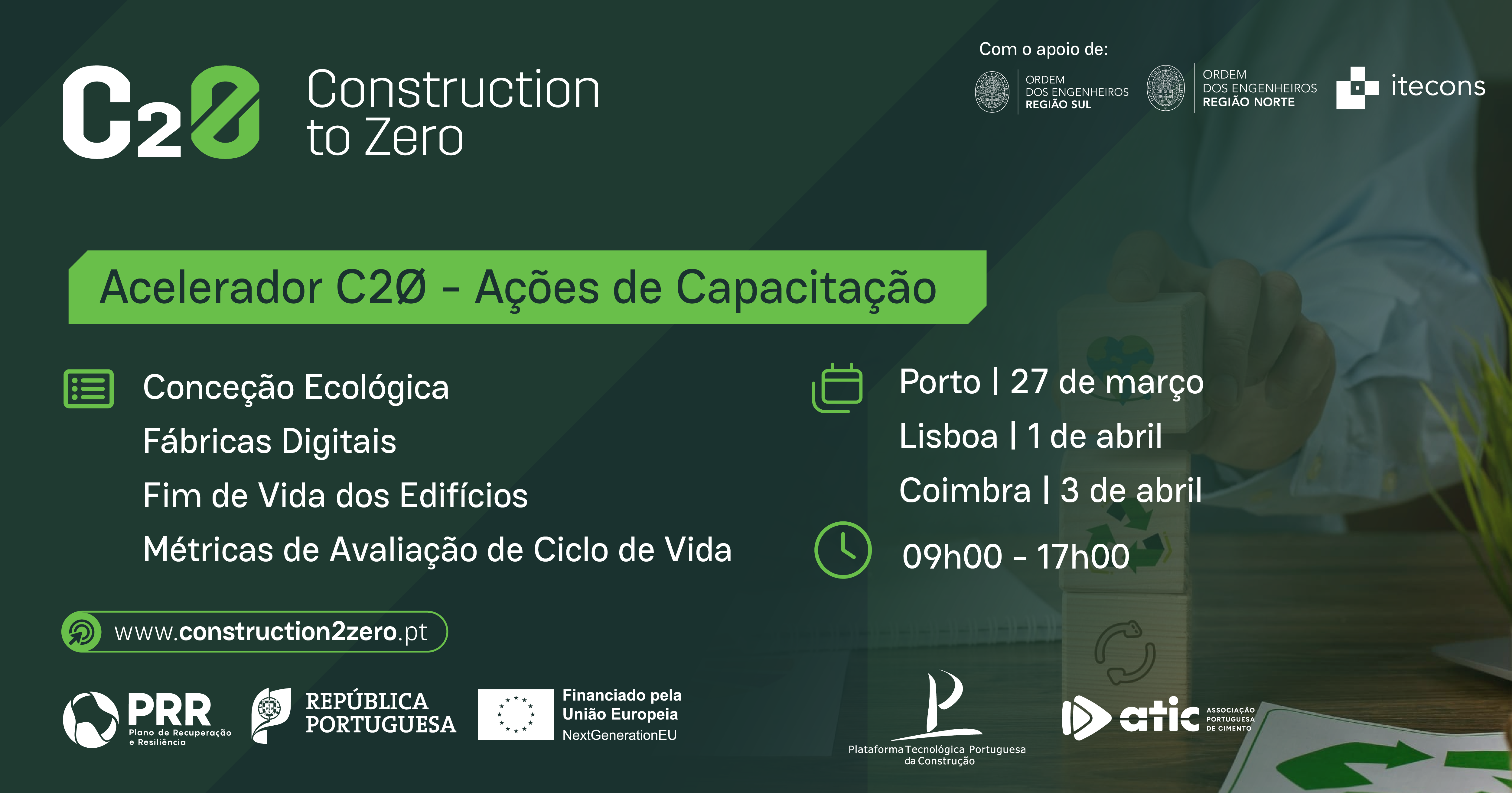 Vão decorrer nos dias 27 de março, 1 e 3 de abril as Ações de Capacitação promovidas pelo C2Ø – Construction to Zero no âmbito da atividade Acelerador C2Ø.